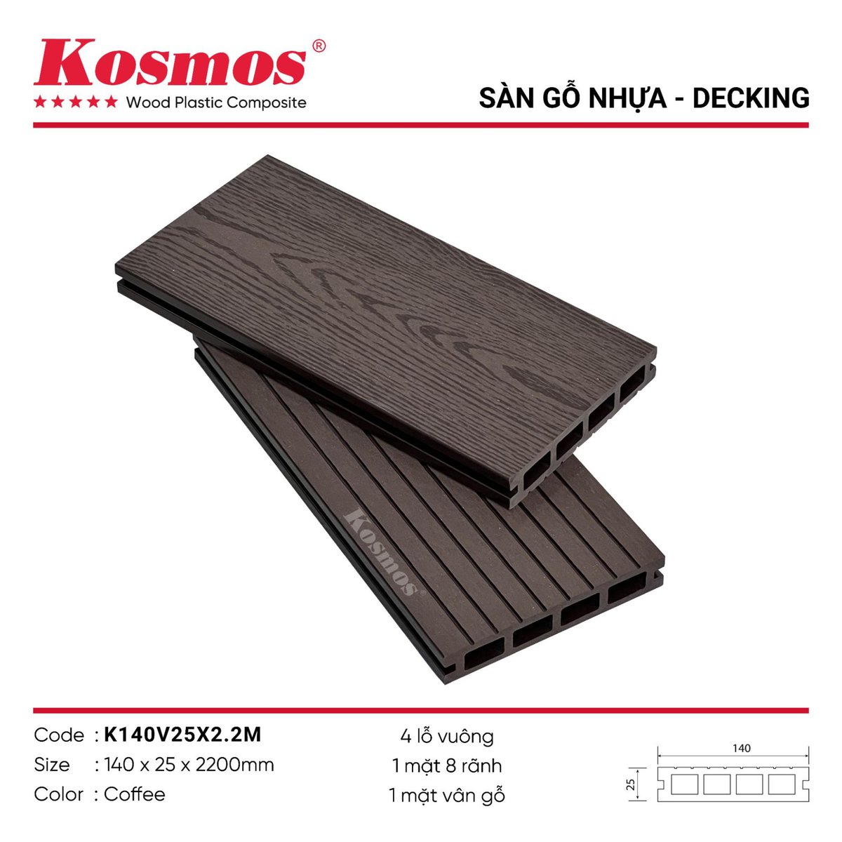 Đây là gỗ nhựa thế hệ thứ nhất, được sản xuất nguyên khối, không tách lớp. Không có lớp phủ nhưng sản phẩm vẫn có khả năng chống trầy cao, bền và chống thấm tốt.